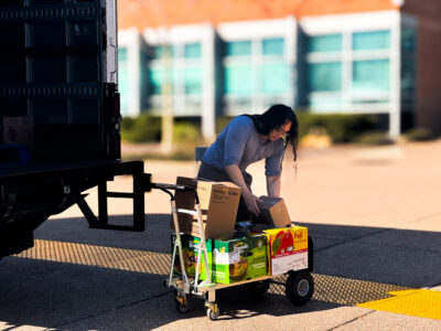 I watched as Byron Butler, from our operations team, along with some student volunteers unload food from our boxed truck. Boxes of food and other pantry staples moved quickly from truck to carts, then into the Welcome Center. Right inside the doors, tables were set up and a line had already begun to form—quiet at first, but full of anticipation.