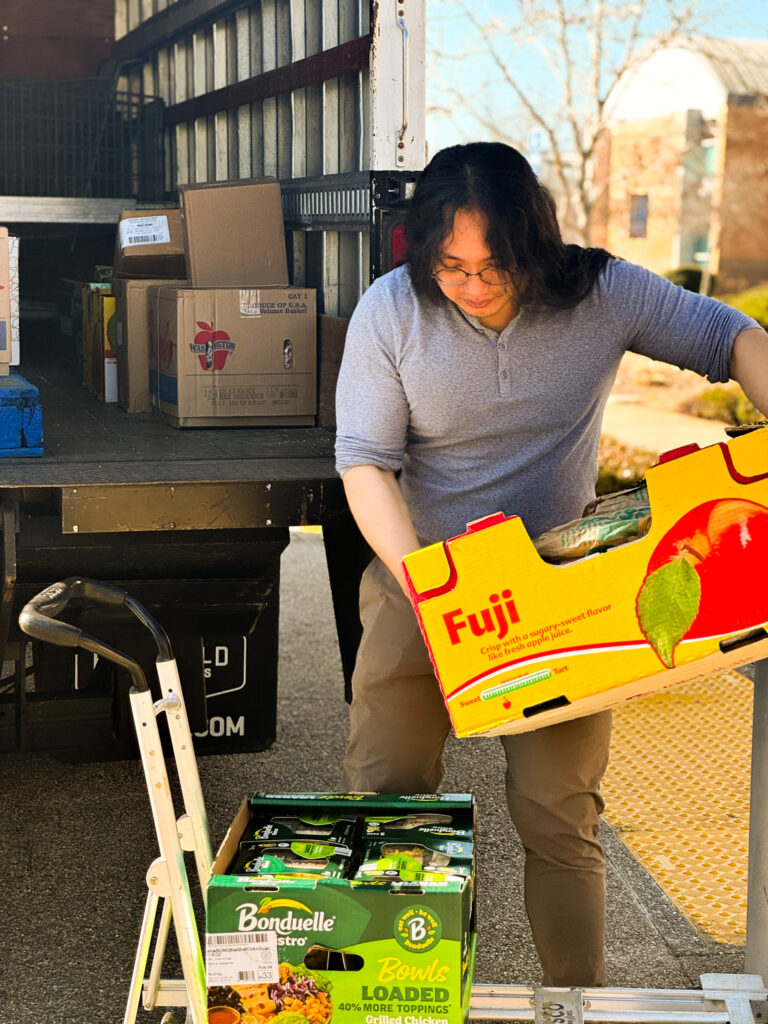 I watched as Byron Butler, from our operations team, along with some student volunteers unload food from our boxed truck. Boxes of food and other pantry staples moved quickly from truck to carts, then into the Welcome Center. Right inside the doors, tables were set up and a line had already begun to form—quiet at first, but full of anticipation.